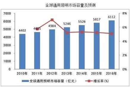 ? ? 據(jù)麥肯錫咨詢公司發(fā)布的全球照明分析報(bào)告,目前全球通用照明占照明器具制造市場大約?75%的份額。2010?年全球通用照明市場容量折算約為?4,402?億元人民幣,2011?達(dá)到?4,655?億元人民幣,增幅?5.8%。未來的幾年中,隨著全球人口的增加、發(fā)展中國家城市化進(jìn)程的加快以及人均可支配收入的持續(xù)增長,通用照明市場將保持持續(xù)穩(wěn)定增長,到?2016?年達(dá)到6,112?億元人民幣。而中國作為照明產(chǎn)品的生產(chǎn)和消費(fèi)大國,在全球照明市場擁有不可替代的地位。