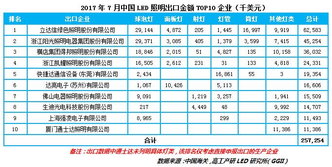 ? 從出口企業來看,2017年7月中國LED照明出口金額前十企業合計占比達12%,整體集中度較小,競爭非常激烈。