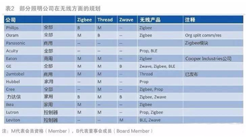 ? 如果深入其中,就會發現照明領域有許多公司(如表2)。從全球聯網照明產品發展趨勢來看,主要包括照明產品和控制器兩部分。表2是聯網照明市場上主要公司的信息,有些做商用照明,有些做家用照明(住宅照明),或者像Philips和Osram等是兩者都有。表2下面的兩家公司是做控制器的。 表2說明了這些領先聯網照明廠商在zigbee/Thread聯盟中扮演的角色,會員(M)在聯盟中是一般身份,而董事會成員(B)則可以指導聯盟的發展方向。在聯盟中,大家都關注zigbee、Thread和Zwave的發展方向,后者是美國的一種Sub-GHz協議,即低于1GHz的私有協議(注:關注Zwave主要不是因為照明,而是用于家庭安防)。