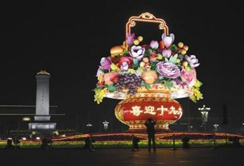 此前,國慶期間,天安門廣場中心花壇仍為“祝福祖國”巨型花籃。相關負責人介紹,大花籃以花果籃為主景,籃內擺放著柿子、石榴、蘋果等。花籃頂高17米,籃體高15.3米;底部采用心形圖案,直徑達50米;籃體南側寫有“祝福祖國,1949-2017”,北側寫有“喜迎十九大”。