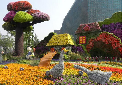 國慶大花籃夜間放“光彩” 地面花卉首次使用LED冷光源投射