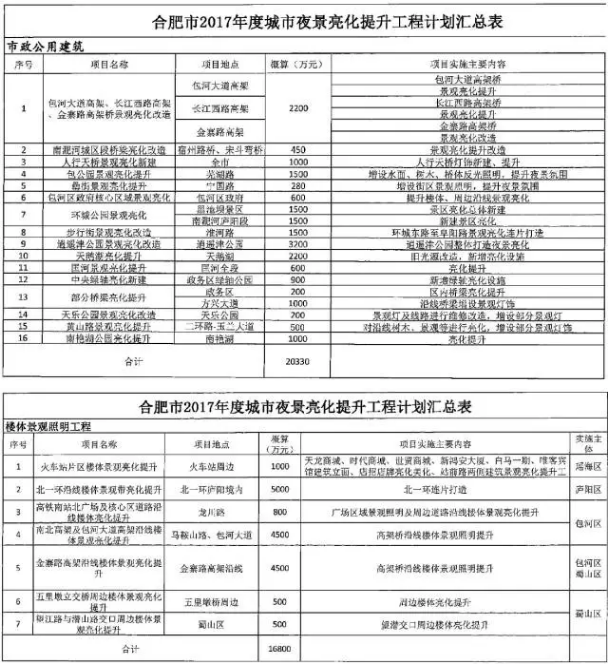 ? 2017年度,合肥計劃實施23項城市亮化工程,主要包括:天鵝湖景區及周邊區域、高鐵南站片區、火車站片區、金寨路高架、包河大道高架、長江西路高架、包河公園、環城公園、南淝河及跨河橋梁、樓體亮化提升等。