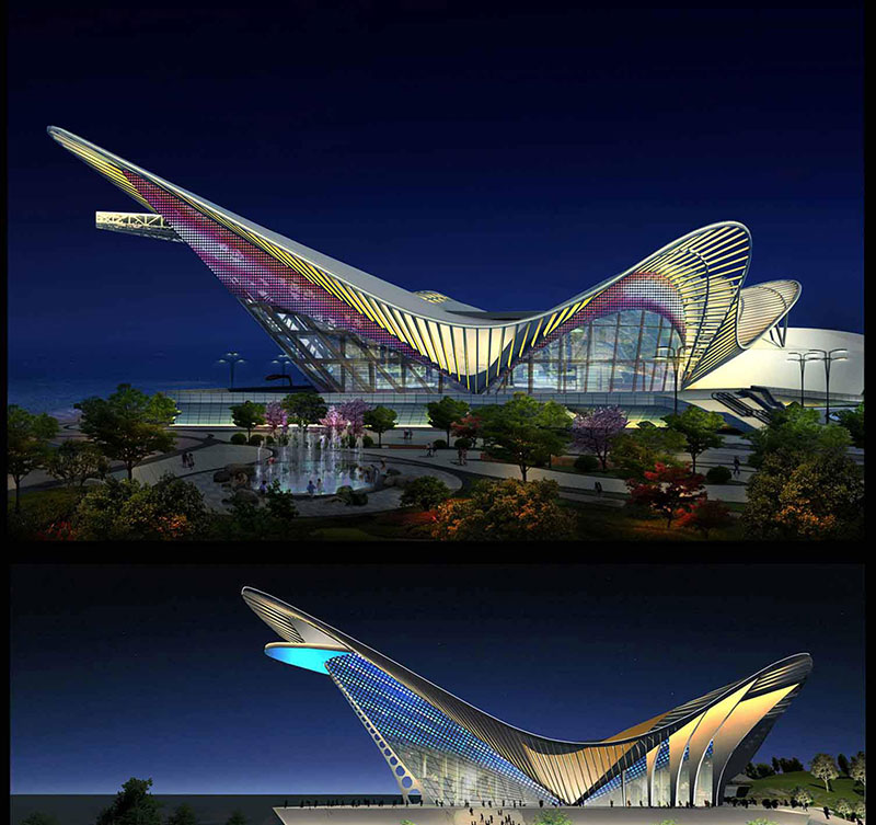 工程建筑面積31313平方米,其中地上8層,建筑高度66米。首層為設備用房及服務用房,層高6米。“鳳凰”的頭頸部匯集餐飲服務,在距地面52米處為設立蹦極平臺;腹部開放綜合餐飲和娛樂大廳;背部為可供游客游覽的綜合廣場;尾部規劃為可容納1200人的國際一流歌劇院。